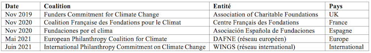 Au-delà de cette philanthropie climatique des big players (grandes fondations internationales), émerge aujourd’hui un nouveau mouvement dans le domaine de la philanthropie du climat : les coalitions de fondations pour le climat, créées dans différents pays européens dès 2019.